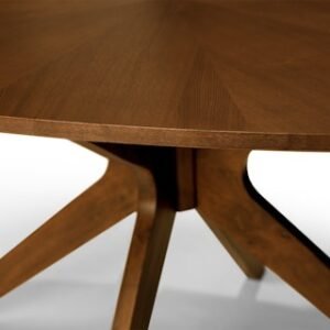 Luxurious and versatile make up the characteristics of the Conan dining table. A stunning sunburst wood veneer top adds glamour while its dynamic centered leg design lends it a wonderful sculptural feel.