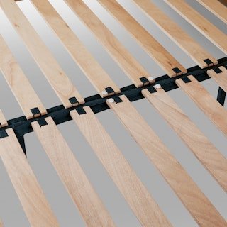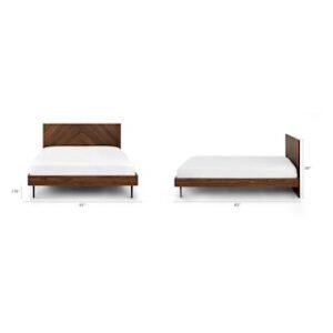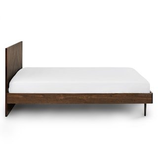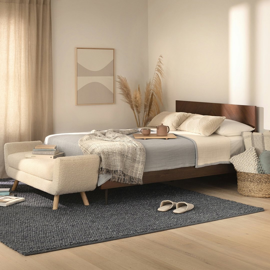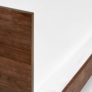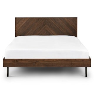 Behind closed doors. Designed to peek out from behind the comfort of a pillow-adorned mattress, the headboard of the low-profile Nera Bed, designed with a subtle chevron pattern, brings a natural warmth to any bedroom. Constructed of solid wood and wood veneer, the Nera features two powder-coated steel legs at the foot of the bed for extra stability.